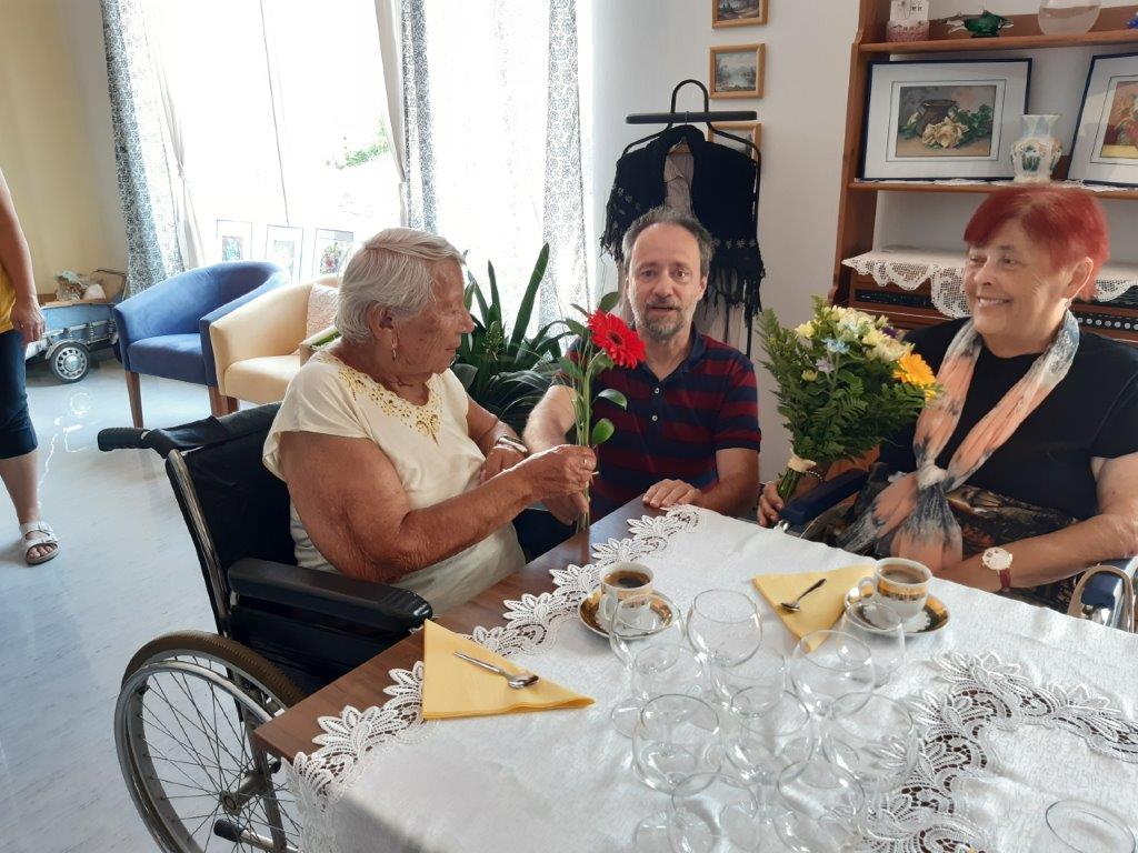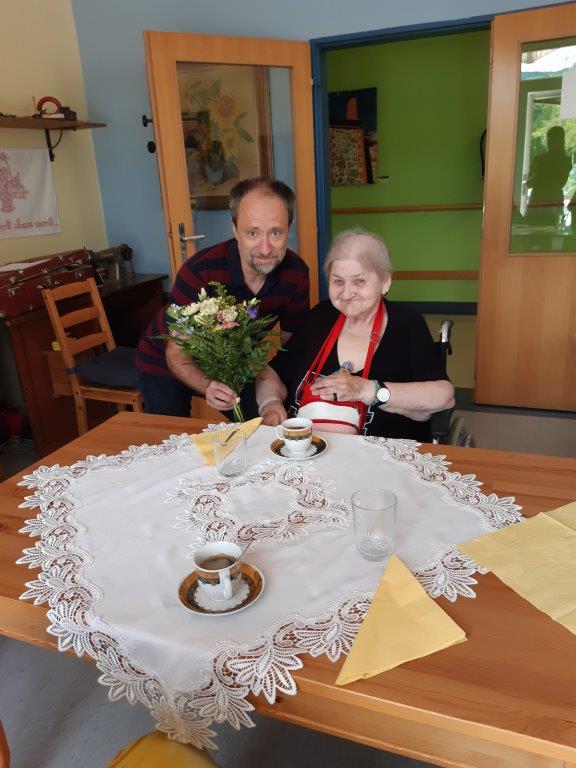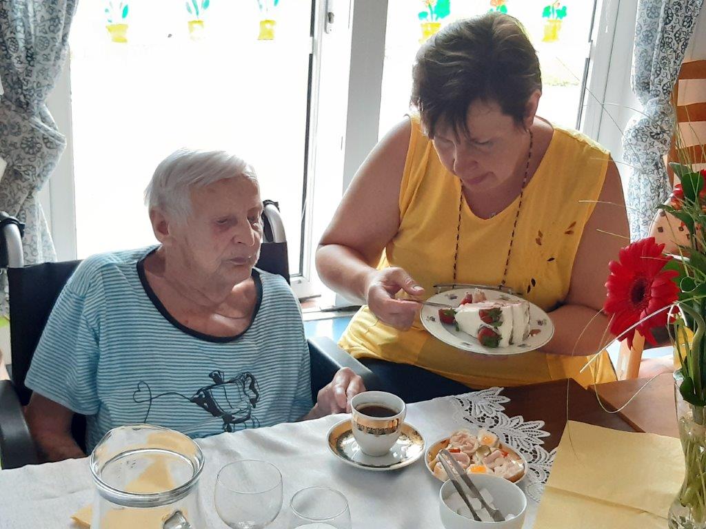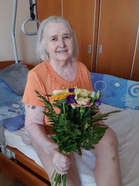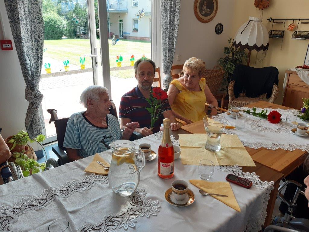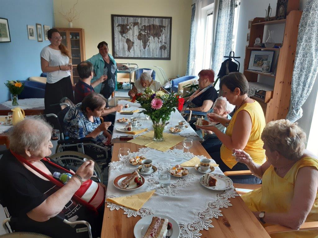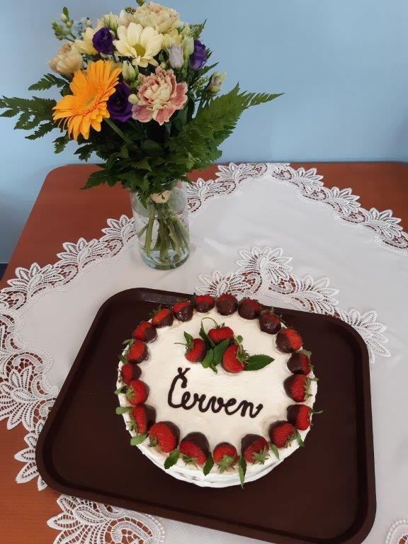 Výborný domácí jahodový dort, kafíčko a slavnostní přípitek si vychutnaly naše oslavenkyně, které se sešly v reminiscenční místnosti 30. června. Ti, kteří se ze zdravotních důvodů nemohli oslavy zúčastnit, dostali kytičku, kávu a dort na pokoj.